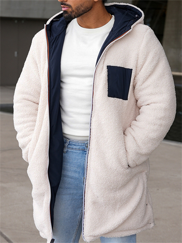 Men's Reversible Double-Faced Hooded Winter Coat with Zipper Color-Blocked Warm Trench Coat