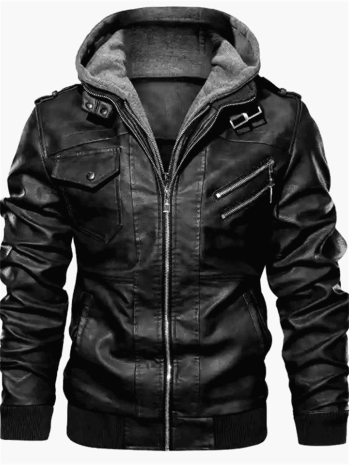 Autumn/Winter Casual Hooded Zipper Youth Black Stand-up Collar Men's Leather Jacket