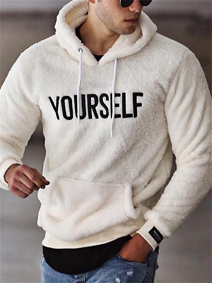 Men's Hoodie Fuzzy Sherpa Black White Khaki Hooded Letter Pocket Print Cool Sportswear Casual Winter Fall & Winter Clothing Apparel Hoodies Sweatshirts Long Sleeve