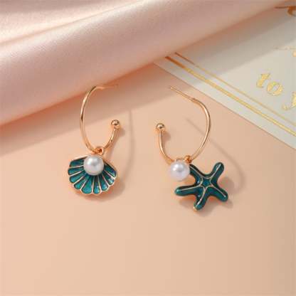 One earring features a golden-rimmed shell. the other a graceful starfish—both accented with a pearl for a unique asymmetrical look.