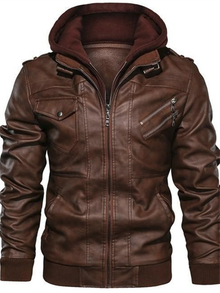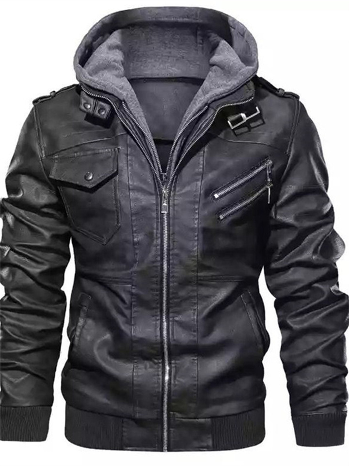 Autumn/Winter Casual Hooded Zipper Youth Black Stand-up Collar Men's Leather Jacket