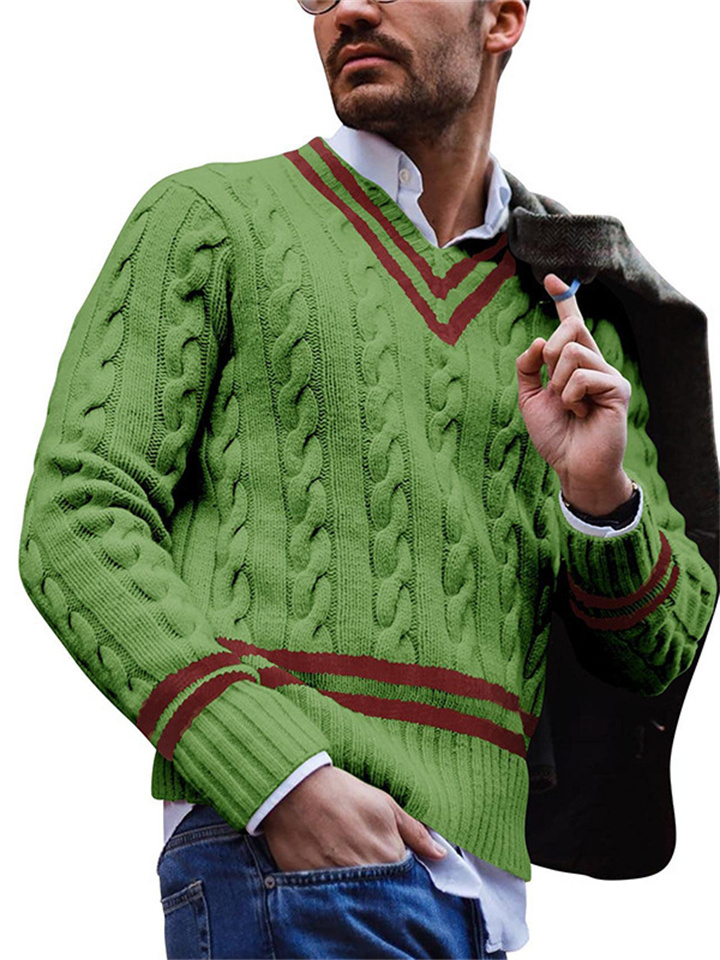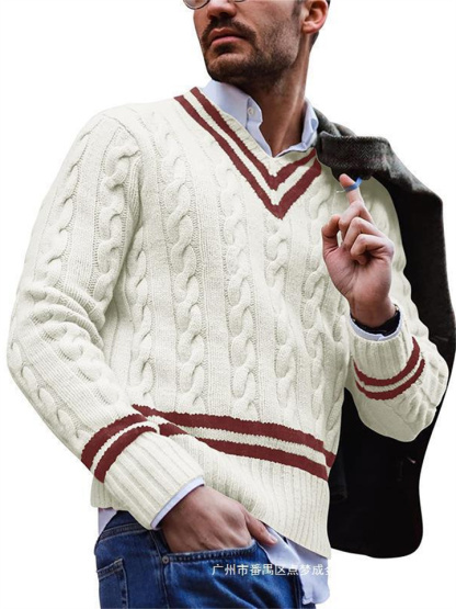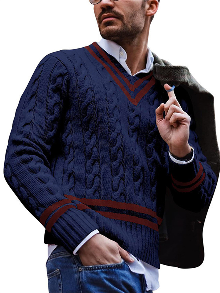 Autumn/Winter V-neck Sweater Men's Striped Color-block Knit Sweater