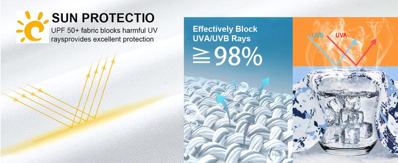 ·UV Protection: UPF 50+ FABRIC greatly prevent your skin from sun ray·High Wicking: Moisture-wicking high-tech fabric can quickly transfer sweat away from the skin,help you keep dry all-day.·Quick Drying:High breathable fabric speeds up the evaporation of sweat,keeping cooling and comfortable·Lightweight :Suitable for sports and outdoor activities