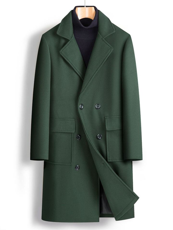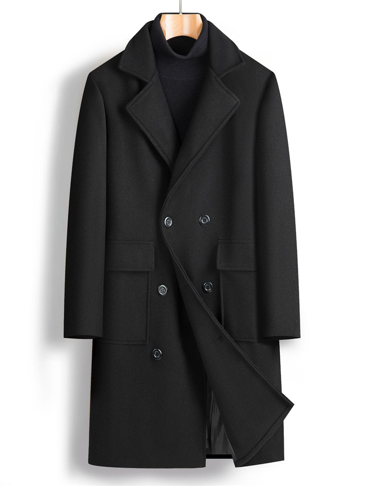 Men's Double-breasted Large Lapel Pockets Youth Solid Color Casual Medium-length Tweed Coat Man