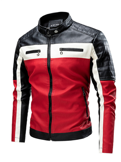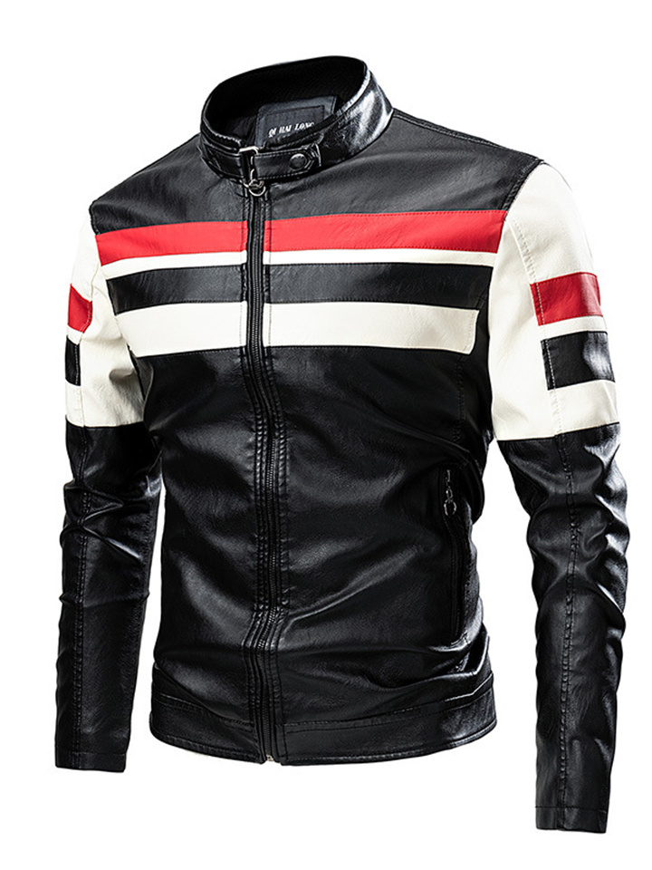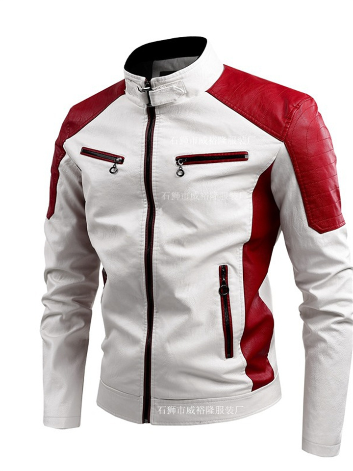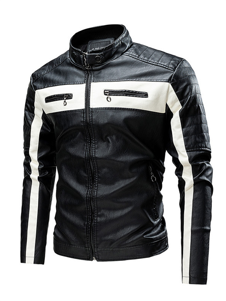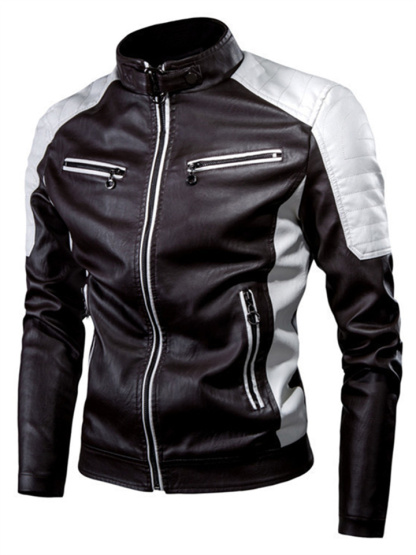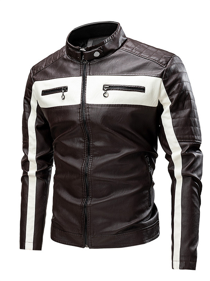 Men's Fall and Winter Casual Biker Splicing Leather Jacket Stand-up Collar Retro Warm Leather Jacket