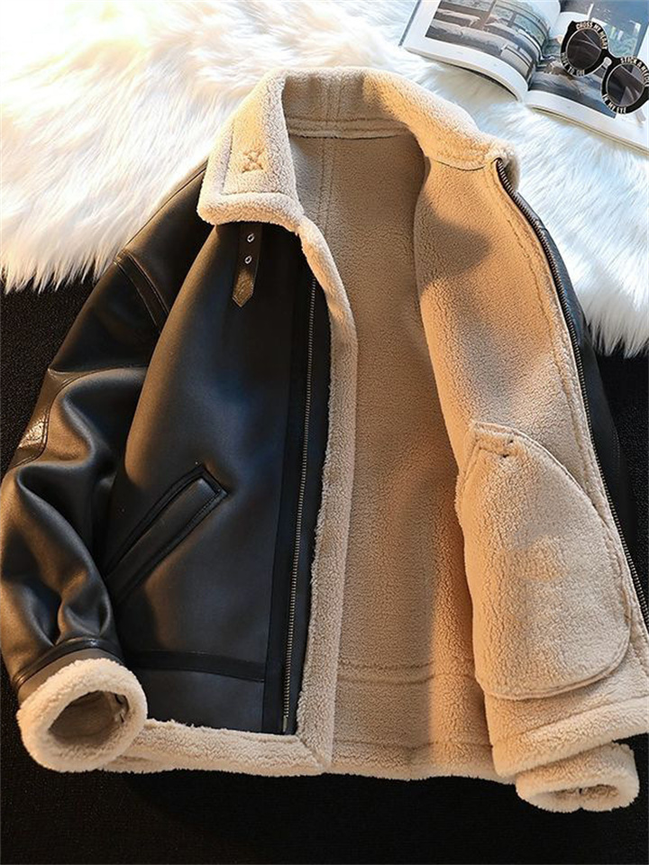 Men's Winter Fleece-Lined Motorcycle Jacket with Shearling Collar, Deer Velvet Fleece Coat, Shearling-Lined Cotton Jacket
