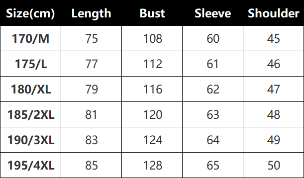Sizes: M-170cm, L-175cm, XL-180cm, XXL-185cm, XXXL-190cm
