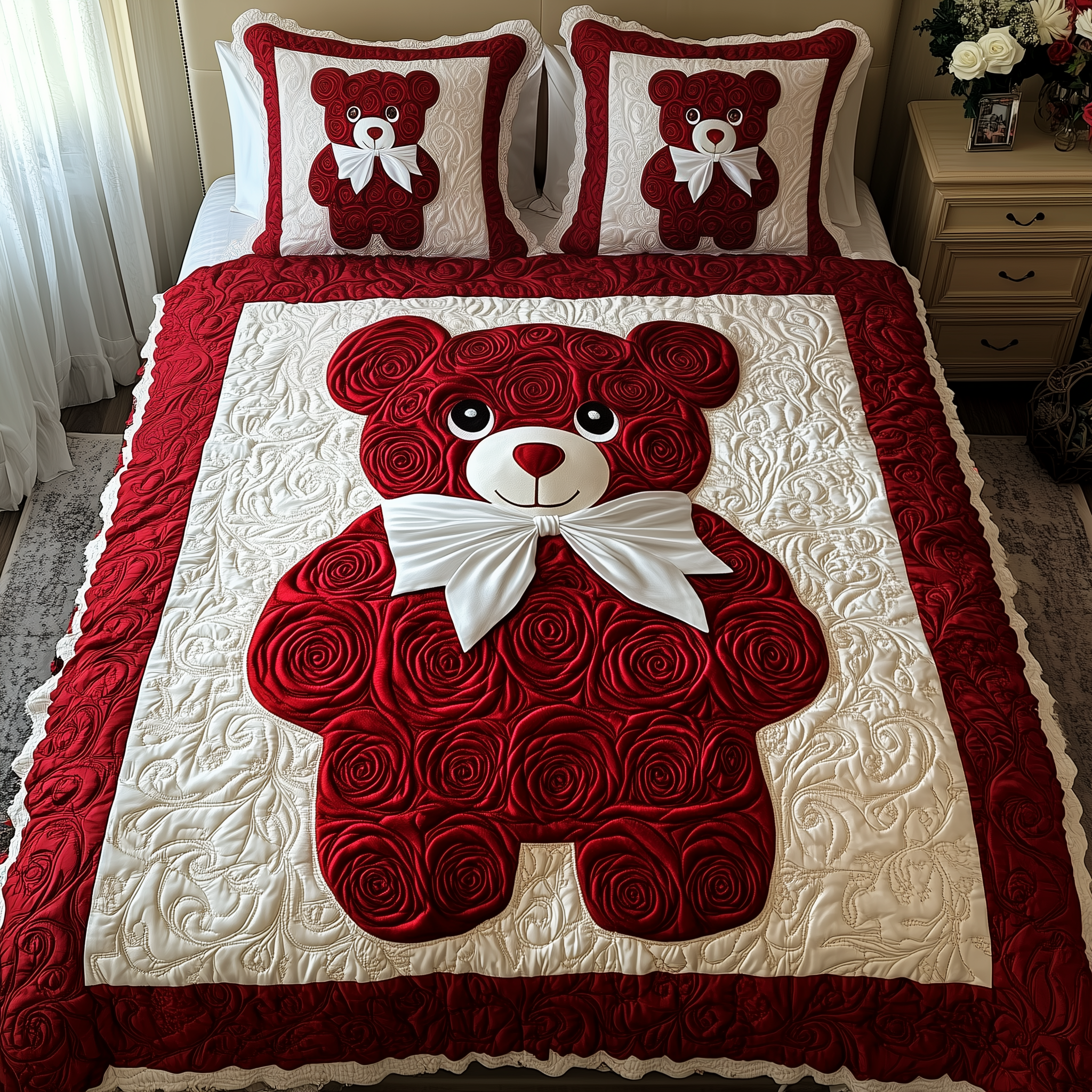 Red Roses Love Bear 3-Piece Quilted Bedding Set GFTOAB2152