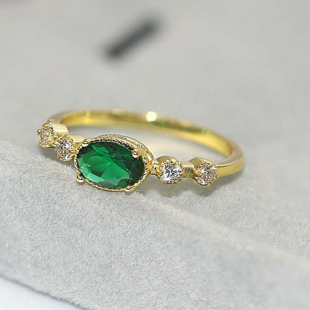Vintage Gold Green Oval Gemstone & Sparkling Side Ring